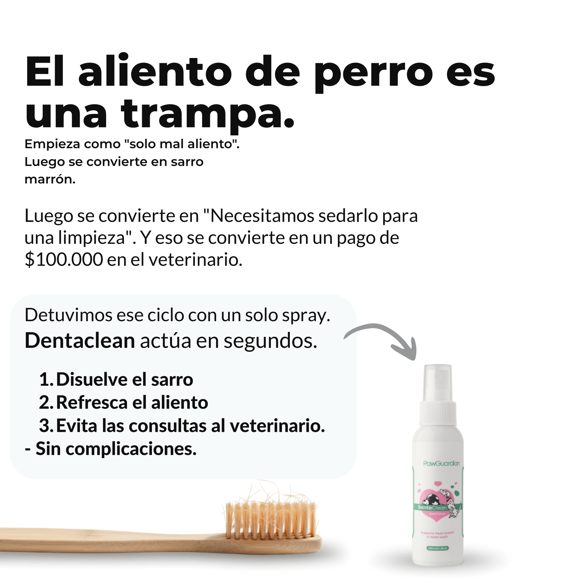 Sabemos lo que es convivir con el mal aliento, el sarro que no se va y la preocupación por las encías de tu mascota, sumado a la culpa de no poder cepillarle los dientes sin estrés. Por eso, si después de usar DentaClean™ durante 30 días no ves mejoras reales en el aliento, la placa/sarro o el confort de sus encías, te devolvemos el 100% de tu dinero.